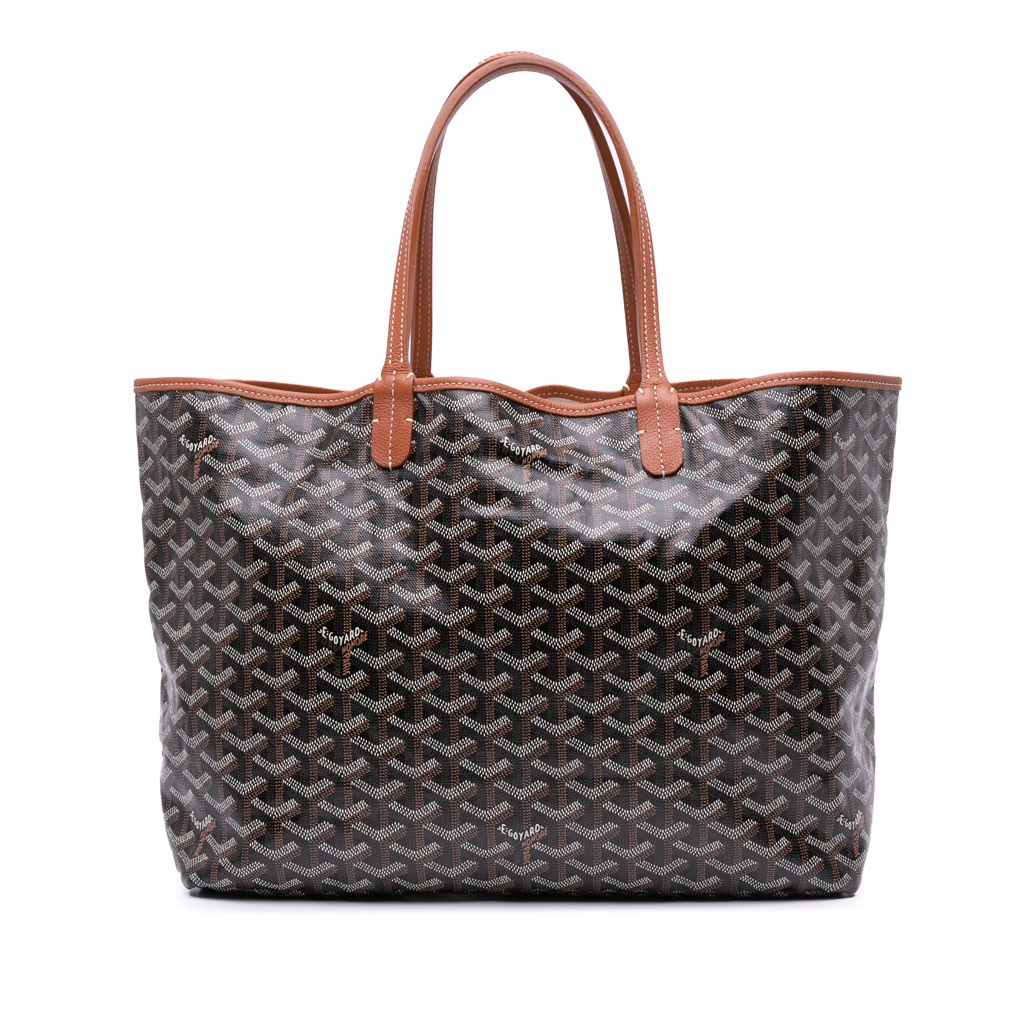 The Saint Louis PM features a coated canvas body with leather trim, flat leather straps, and an open top.