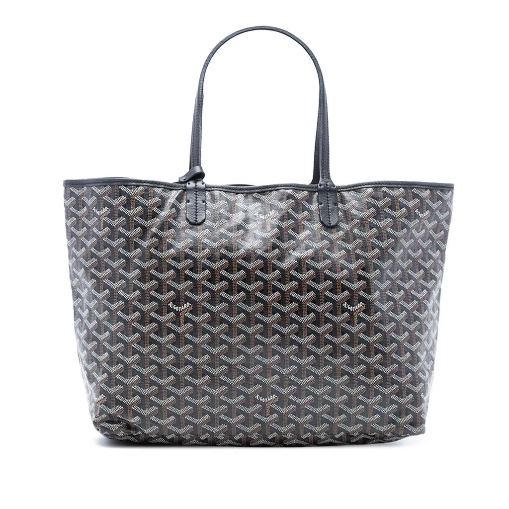 The Saint Louis PM features a coated canvas body with leather trim, flat leather handles, an open top, and a pouch inclusion.