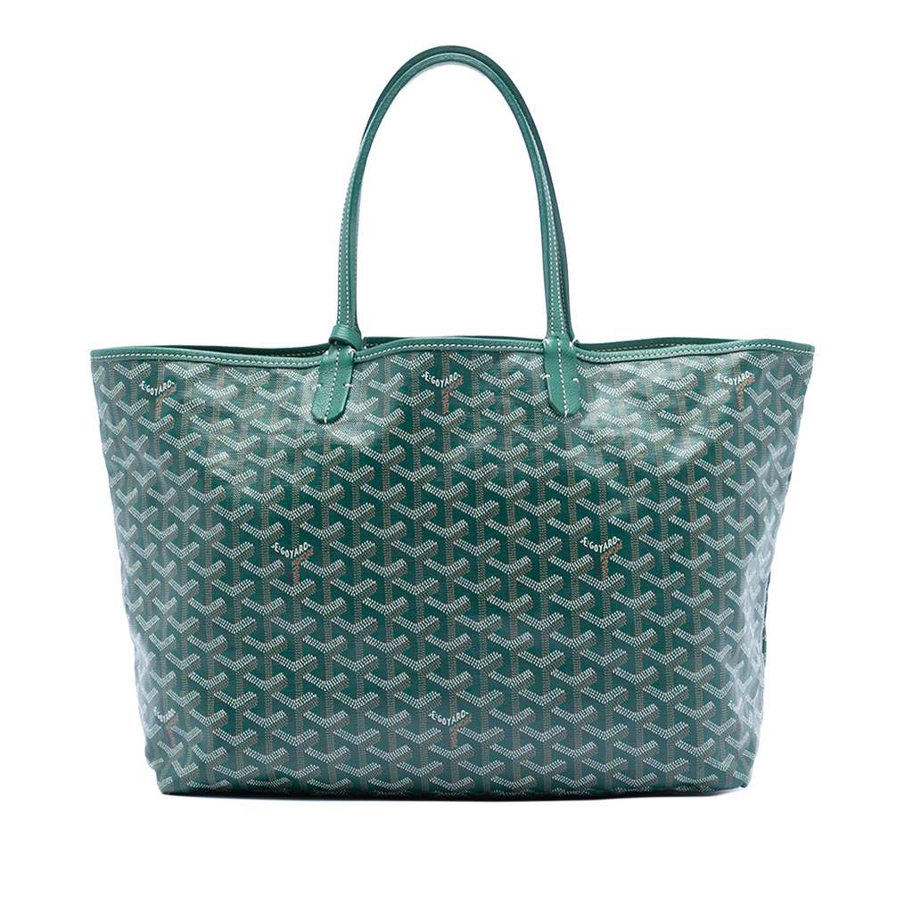 The Saint Louis PM features a coated canvas body with leather trim, flat leather handles, an open top, and a pouch inclusion.