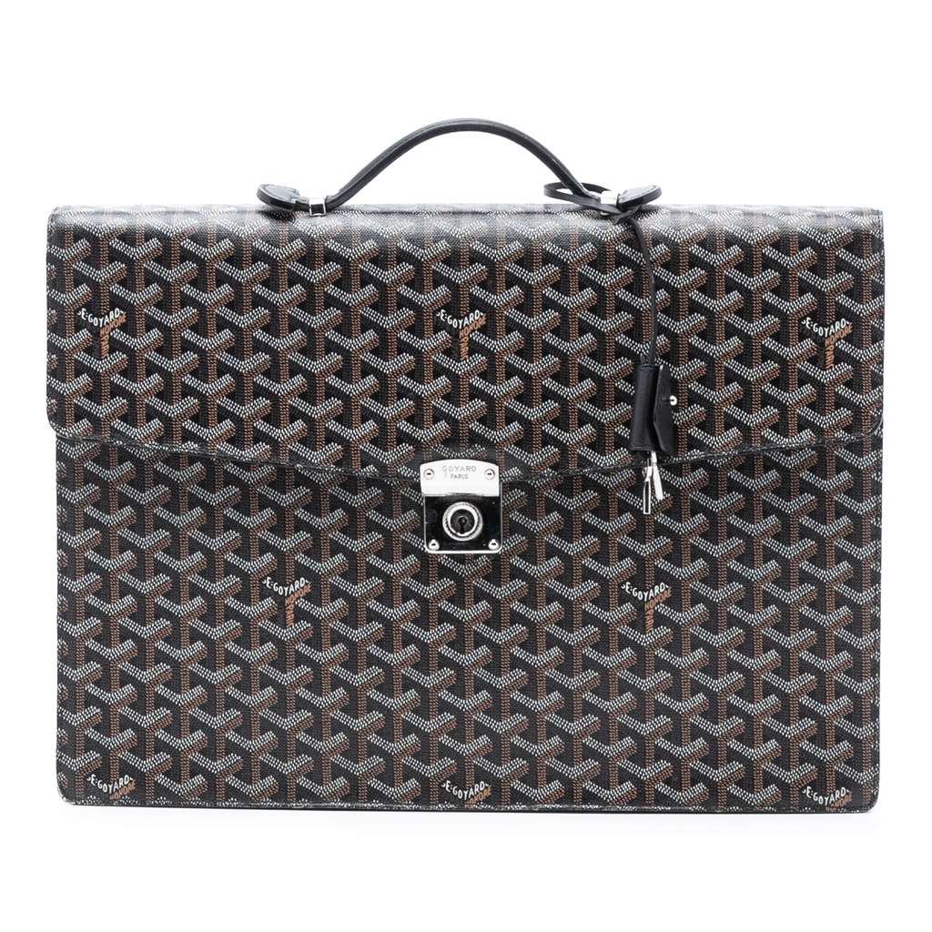 The Serviette Chypre features a coated canvas body, a flat leather top handle, a flap with metal closure, and an exterior slip pocket.