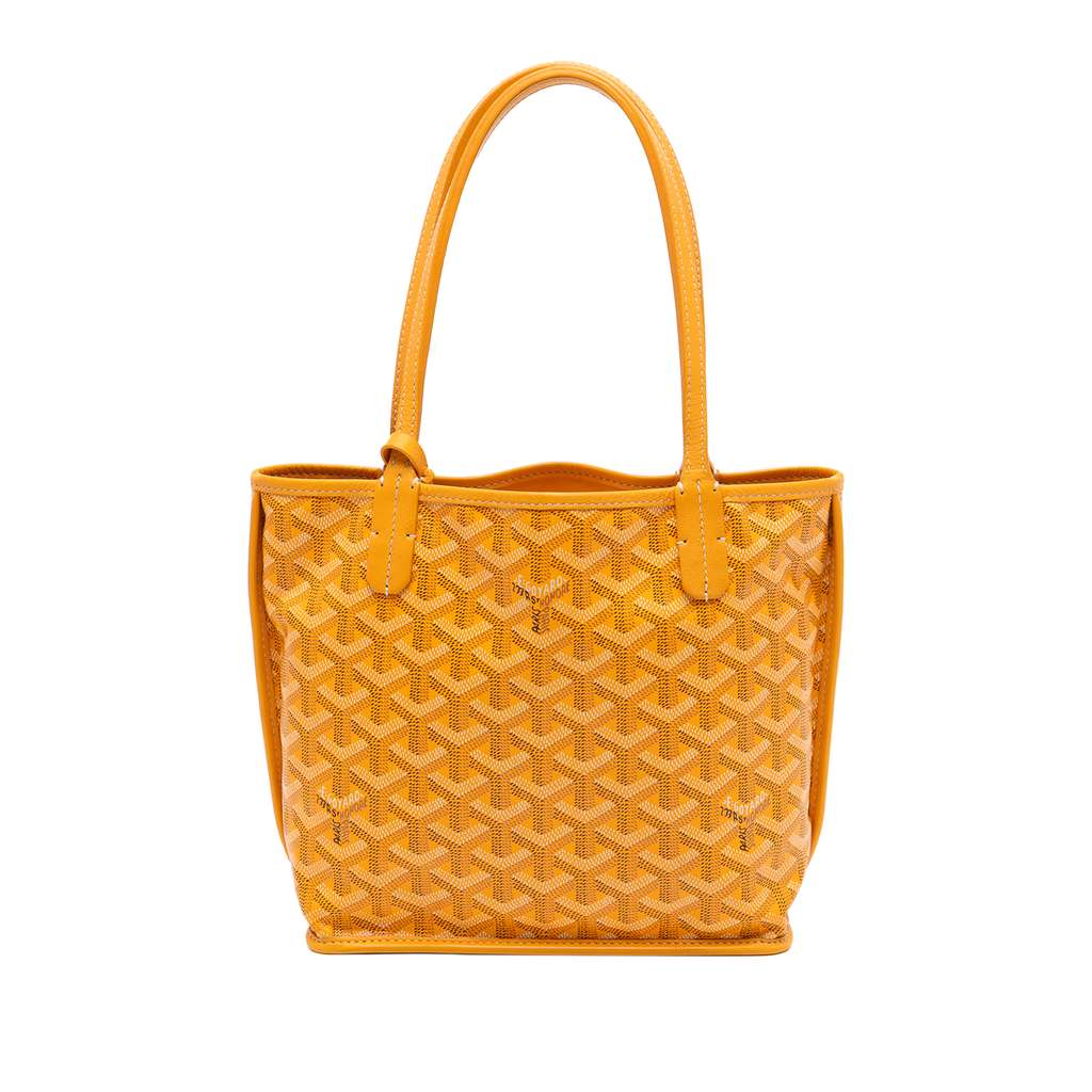 The Mini Anjou Tote bag features a reversible coated canvas and leather body, flat leather handles, an open top, and a pouch inclusion.