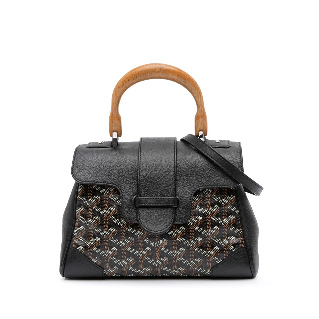 The Mini Saigon features a coated canvas body with leather trim, a wooden top handle, a detachable flat leather strap, a front flap with slip-through closure, and an interior slip pocket.