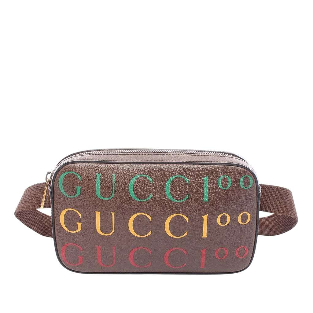 The 100th Anniversary Belt Bag features a printed leather body, a top zip closure, a flat canvas strap with leather belt buckle closure, and an interior zip and slip pockets.