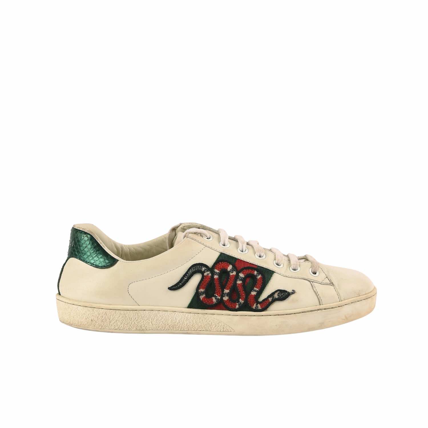 Low-top style leather sneakers with snakeskin embossed heel accent and embroidered snake detail. Includes extra laces