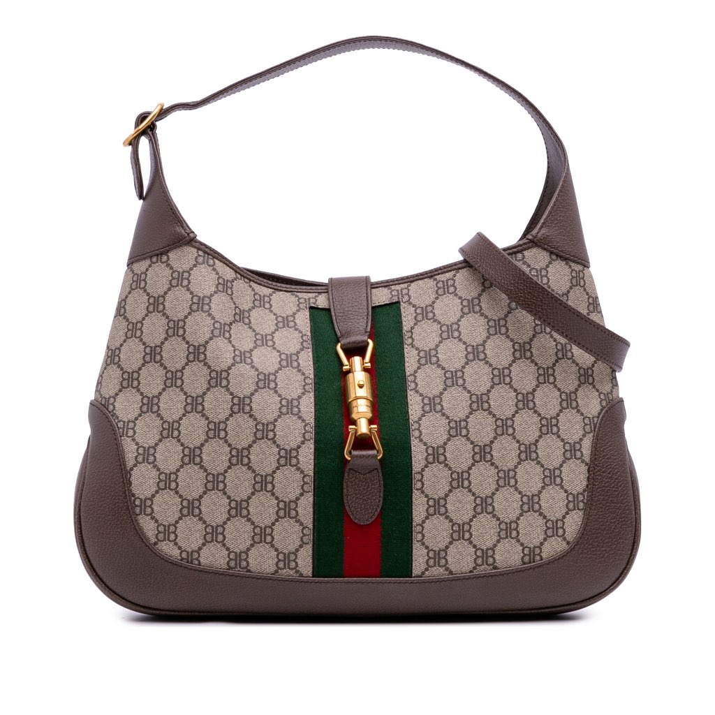 The Jackie 1961 features a coated canvas body with leather trim and web detail, a flat leather strap, a detachable leather strap extender, an open top with a flat strap and a piston lock closure, and an interior slip pocket.