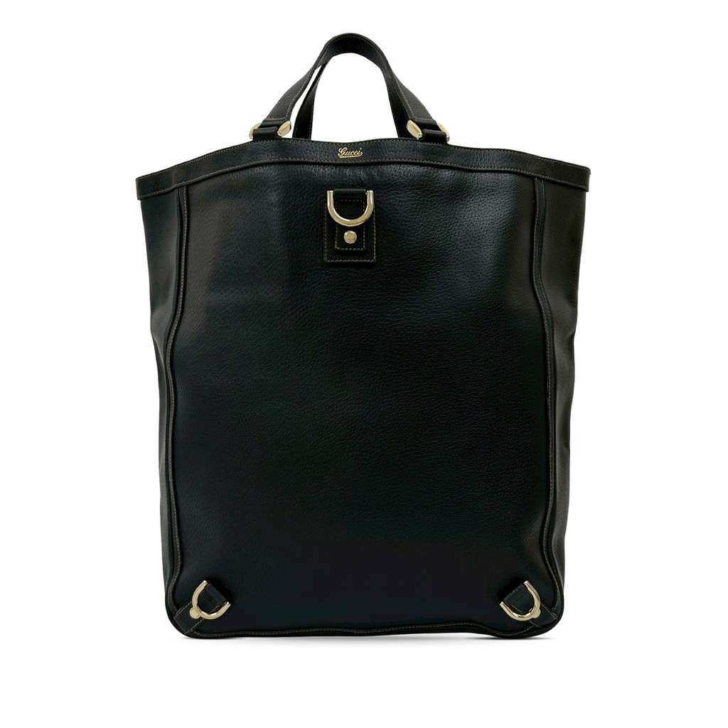 This tote bag features a leather body, flat leather handles, an open top, and interior zip and slip pockets.