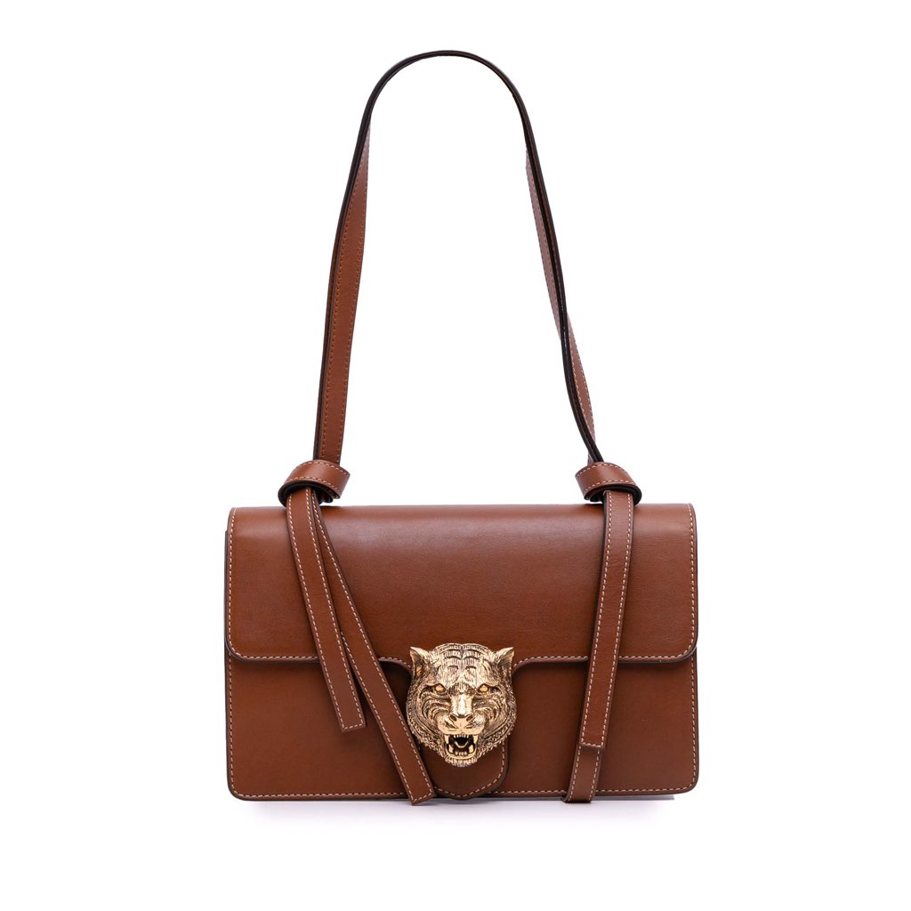 This shoulder bag features a leather body, flat leather strap, a front flap with magnetic snap closure, interior zip and slip compartments, and interior zip and slip pockets.
