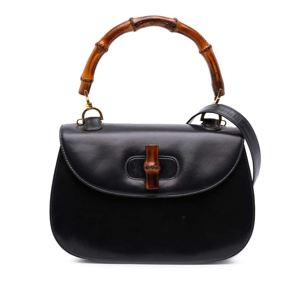 The Bamboo Night features a leather body, a bamboo top handle, a detachable flat leather shoulder strap, a flap with bamboo turn lock closure, and interior zip and slip pockets.