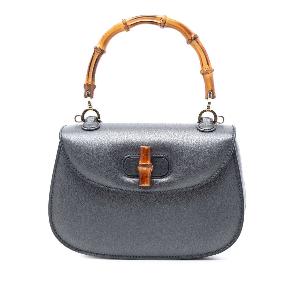 The Bamboo Night features a leather body, a bamboo top handle, a flap with bamboo turn lock closure, and interior zip and slip pockets. The top was repainted.