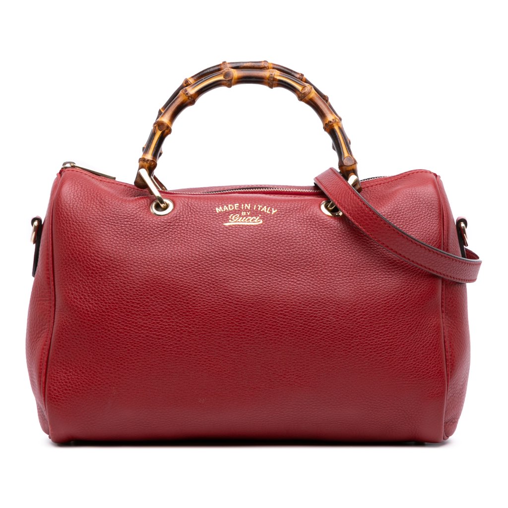 This satchel features a leather body, bamboo top handles, a detachable flat leather strap, a top zip closure, and interior zip and slip pockets.