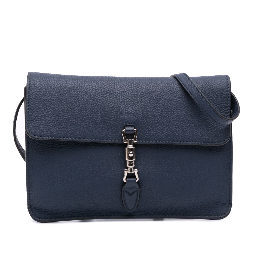 The Jackie crossbody bag features a leather body, an adjustable flat leather strap, a front flap with a piston lock closure, and an interior slip pocket.