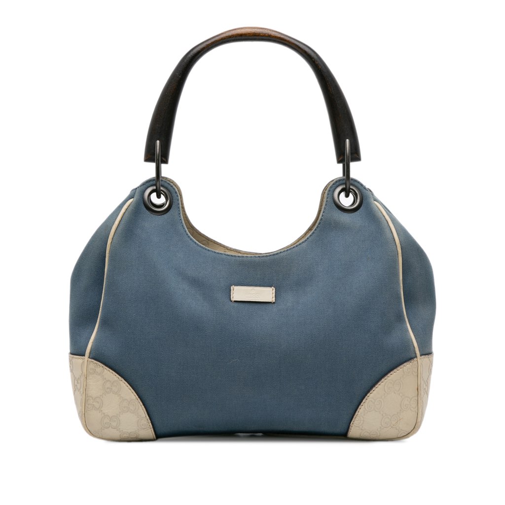 This shoulder bag features a canvas body with leather trim, a bamboo top handle, an open top, and an interior zip pocket.