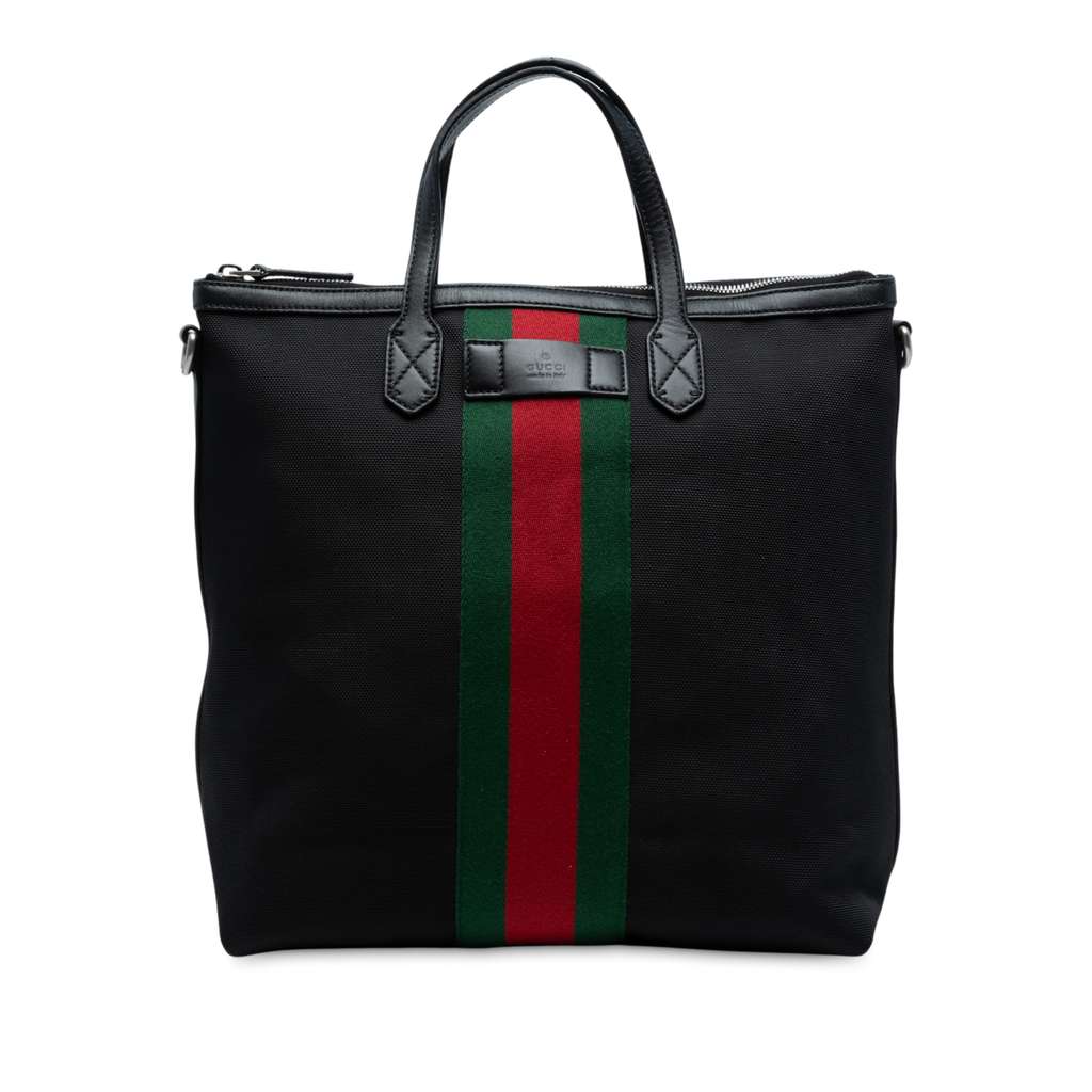 This satchel features a canvas body with web detail and leather trim, flat leather handles, an adjustable flat strap, a top zip closure, and interior zip and slip pockets.
