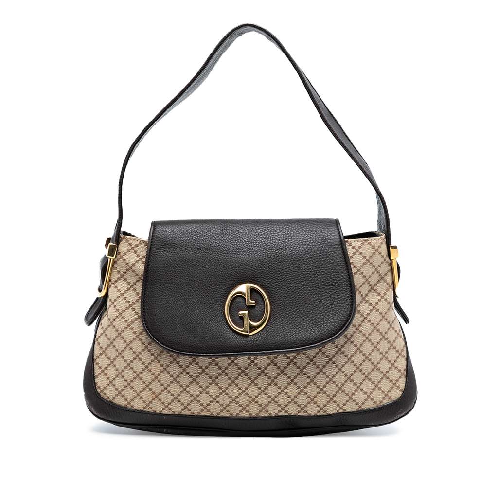 The 1973 shoulder bag features a canvas body with leather trim, a flat leather strap, a front flap with a magnetic closure, and interior zip and slip pockets.