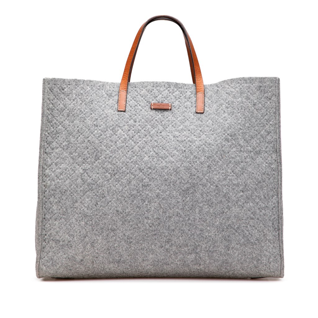 This tote bag features a wool body, flat leather straps, and an open top.