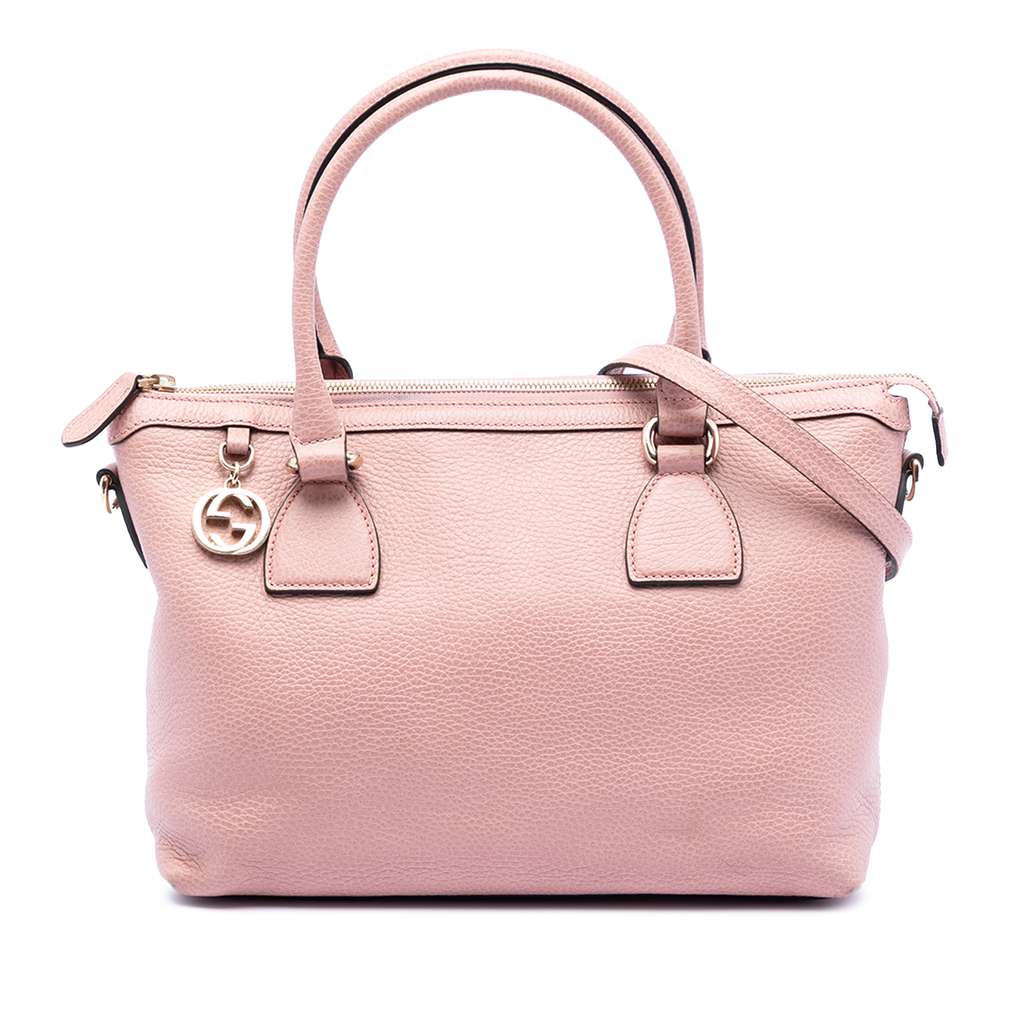 This satchel features a leather body, rolled leather handles, a detachable flat leather strap, a top zip closure, and interior zip and slip pockets.
