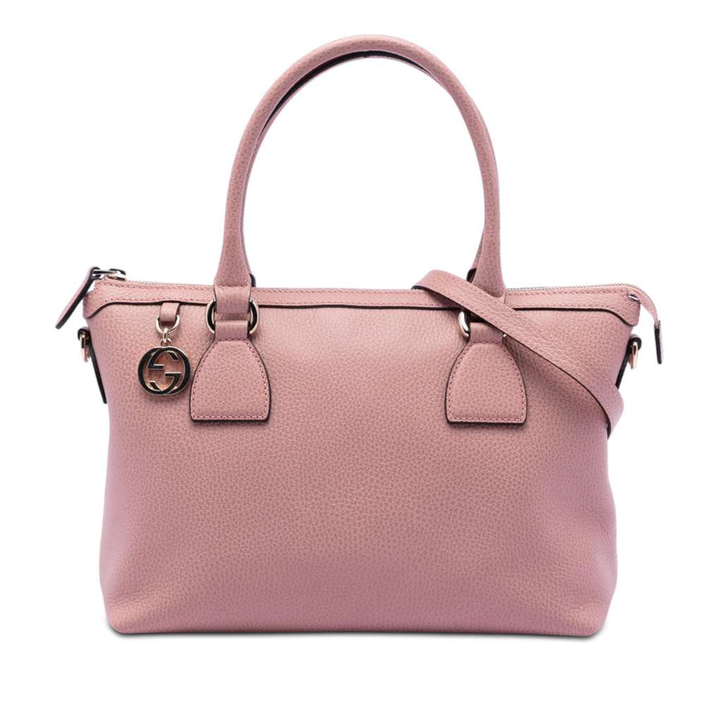 This satchel features a leather body, rolled leather handles, a detachable flat leather strap, a top zip closure, and interior zip and slip pockets.