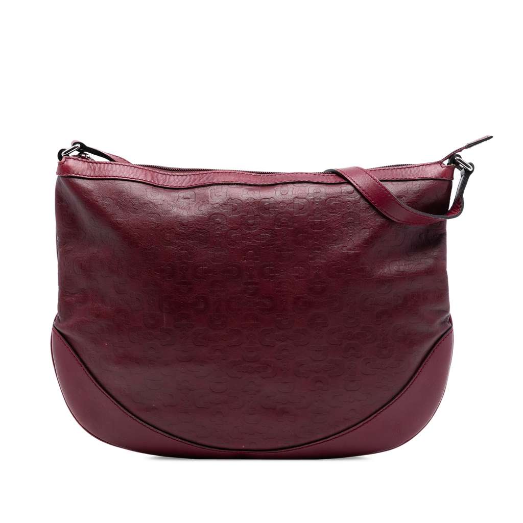 This crossbody bag features an embossed leather body, an adjustable flat leather strap, a top zip closure, and an interior zip pocket.