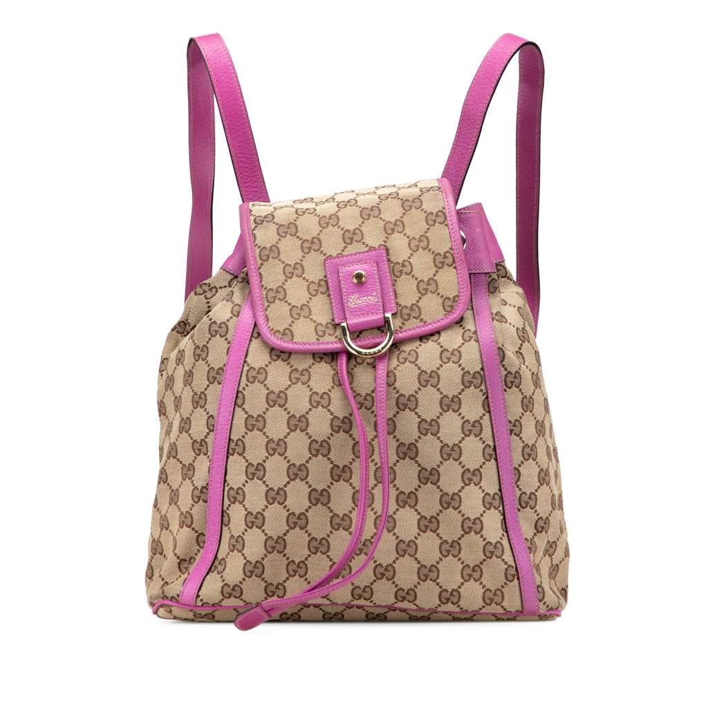 This backpack features a canvas body with leather trim, a flat leather top handle, adjustable flat leather back straps, a front flap with drawstring closure, and an interior zip pocket.