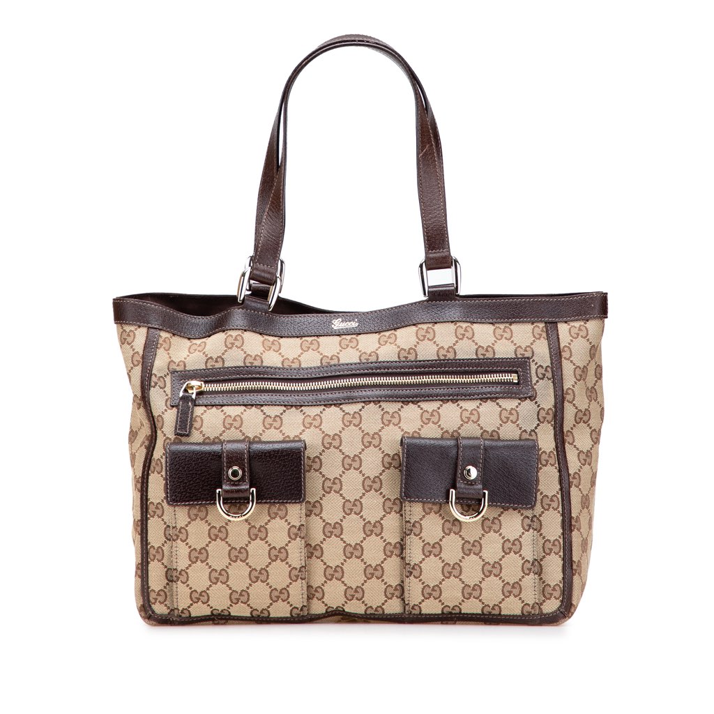 This tote bag features a canvas body with leather trim, flat leather straps, an open top with a magnetic closure, front exterior zip and flap pockets, and interior zip and slip pockets.