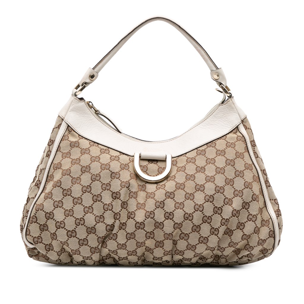 The Abbey D-Ring features a canvas body with leather trim, a rolled leather shoulder strap, a top zip closure, and interior zip and slip pockets.