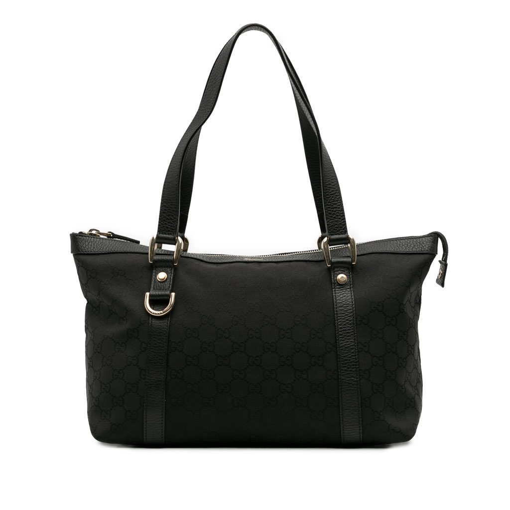 This tote bag features a canvas body with leather trim, flat leather straps, a top zip closure, and interior slip pockets.