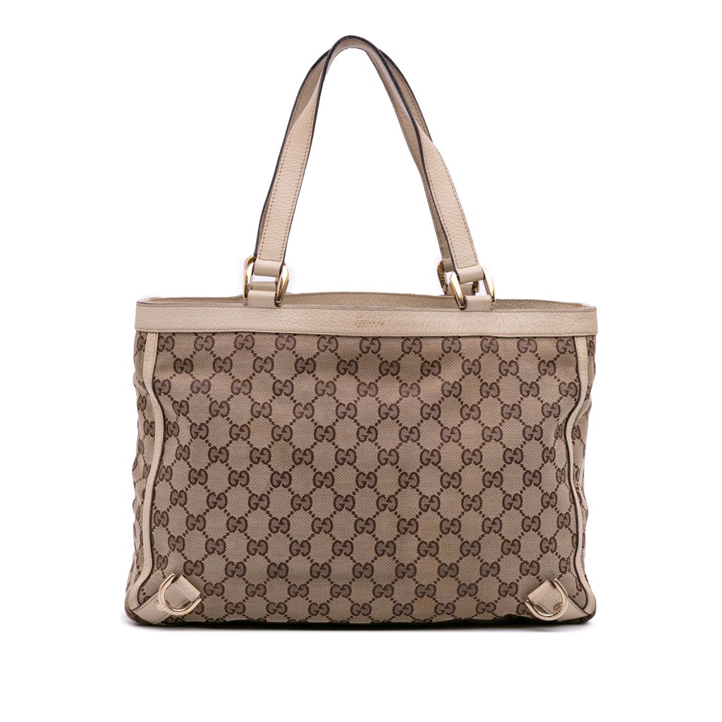 The Abbey D-Ring tote bag features a canvas body with leather trim, flat leather straps, an open top with a magnetic closure, interior zip and slip compartments, and interior zip and slip pockets.