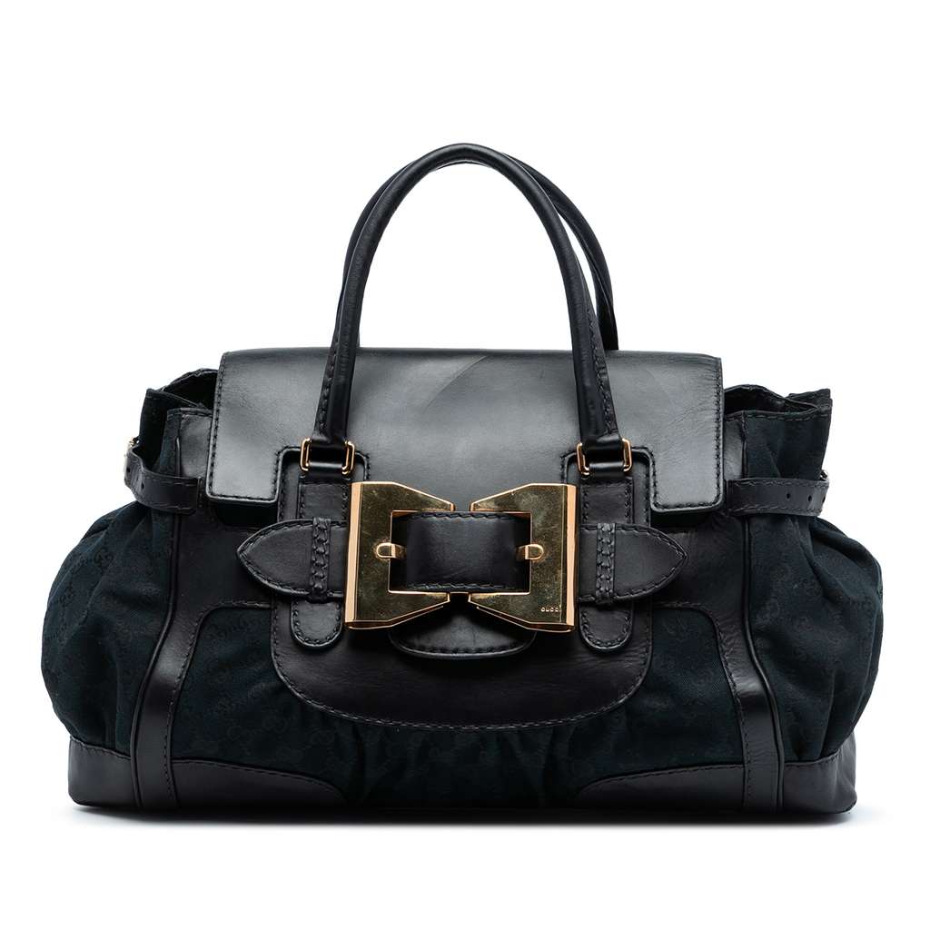 The Dialux Queen features a canvas body and leather body, rolled leather handles, a front flap with buckle details, an open top, and interior zip and slip pockets.