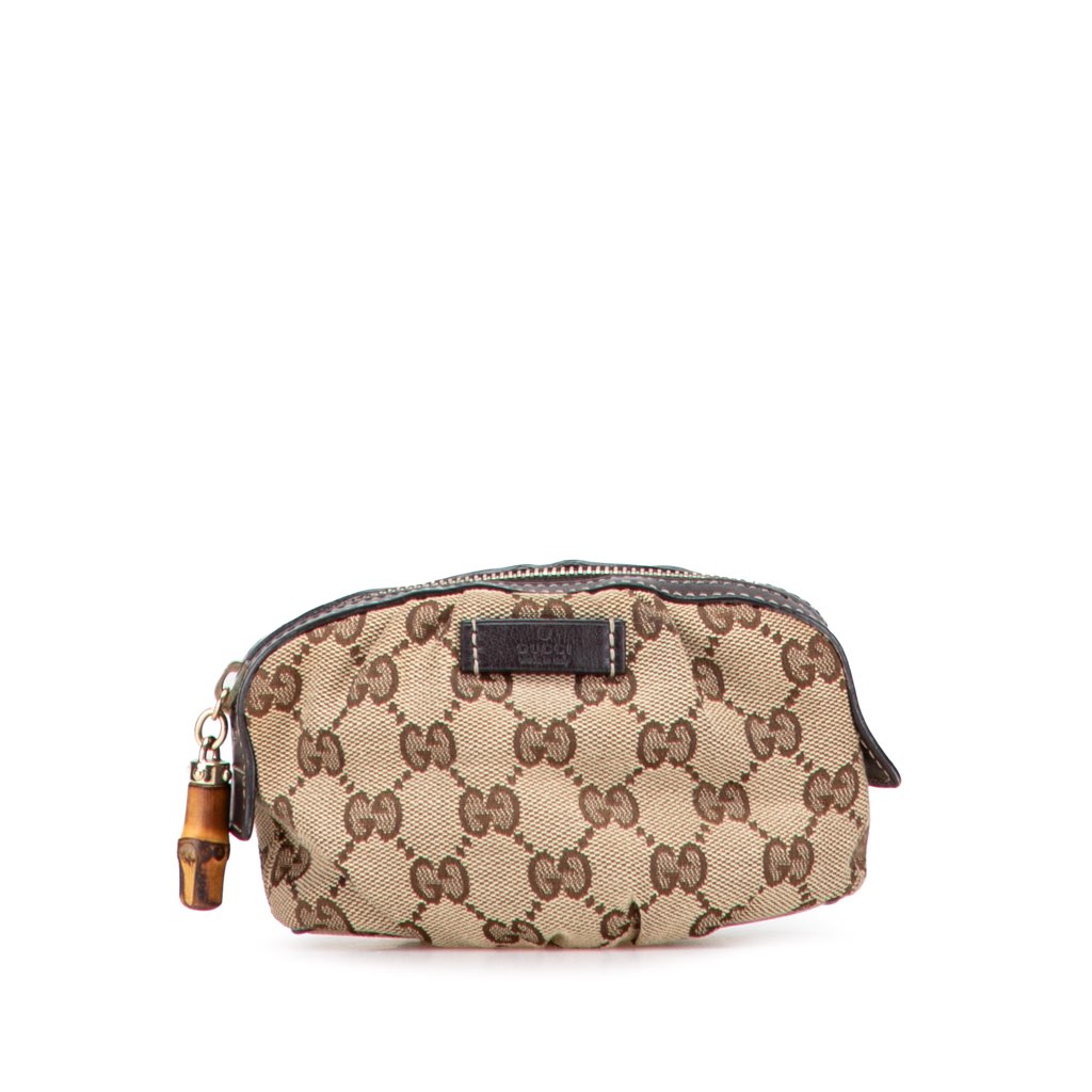 This pouch features a canvas body with leather trim and a top zip closure with bamboo zipper pull.