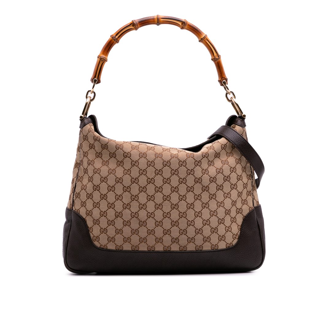 The Diana satchel features a canvas body with leather trim, a bamboo top handle, a detachable flat leather strap, an open top, and interior zip and slip pockets.