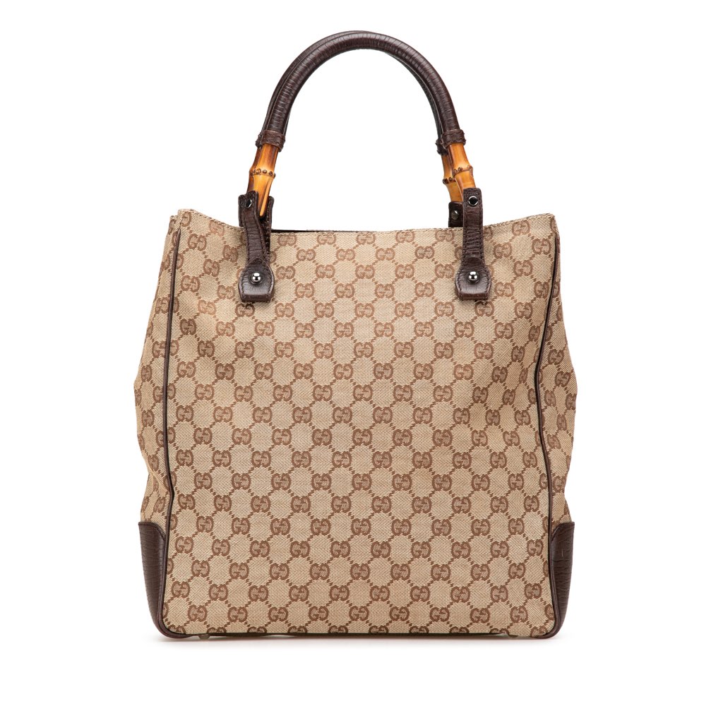 This tote bag features a canvas body with leather trim, rolled handles with bamboo details, an open top, and an interior zip pocket.