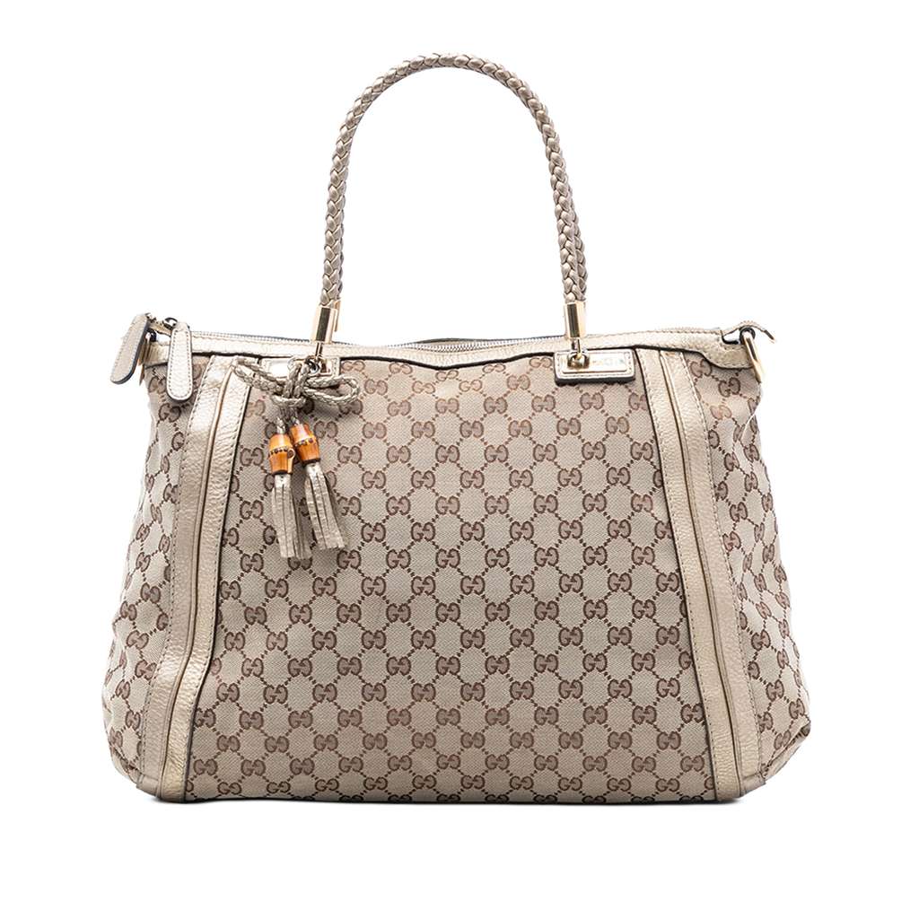 The Bella satchel features a canvas body with leather trim, braided leather handles, a top zip closure, and interior slip and zip pockets.