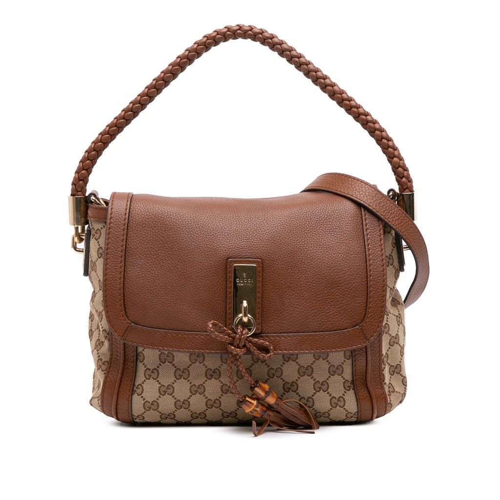 The Bella satchel features a canvas body with leather trim, a braided leather handle, a detachable flat leather shoulder strap, a flap with magnetic snap closure, and interior zip and slip pockets.
