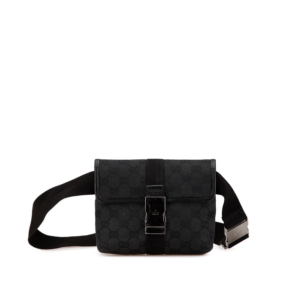 This belt bag features a canvas body with leather trim, an adjustable flat waist strap, a flap with buckle closure, and an interior zip pocket.