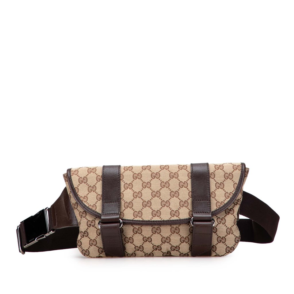 This belt bag features a canvas body with leather trim, flat waist strap with buckle closure, a top flap with touch fastener closures, and an interior zip pocket.