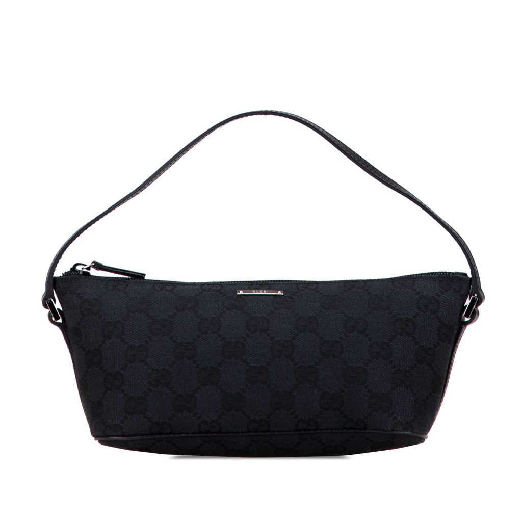 GG Canvas Boat Shoulder Bag features a canvas body with leather trim, a flat leather strap, and a top zip closure.