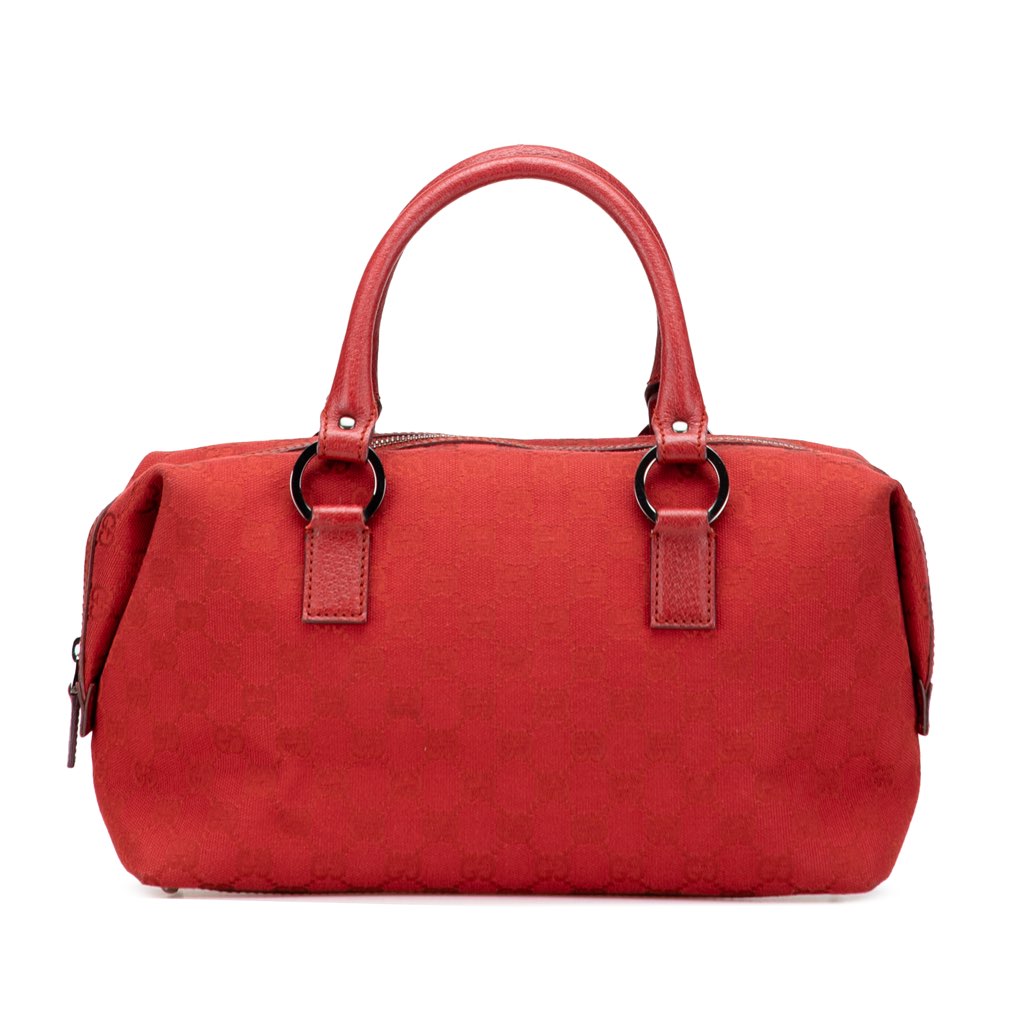 This boston bag features a canvas body with leather trim, rolled leather handles, a top zip closure, and an interior zip pocket.