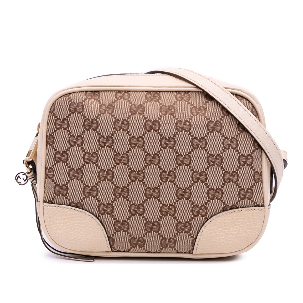 The Bree features a canvas body with leather trim, a flat leather shoulder strap, a top zip closure, and interior slip pockets.