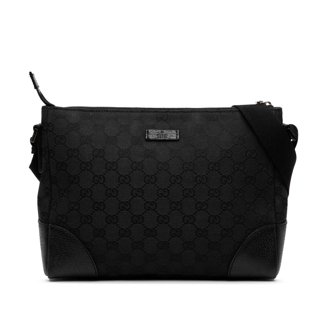 This crossbody bag features a canvas body with leather trim, an adjustable flat canvas strap, a top zip closure, and an interior zip pocket.