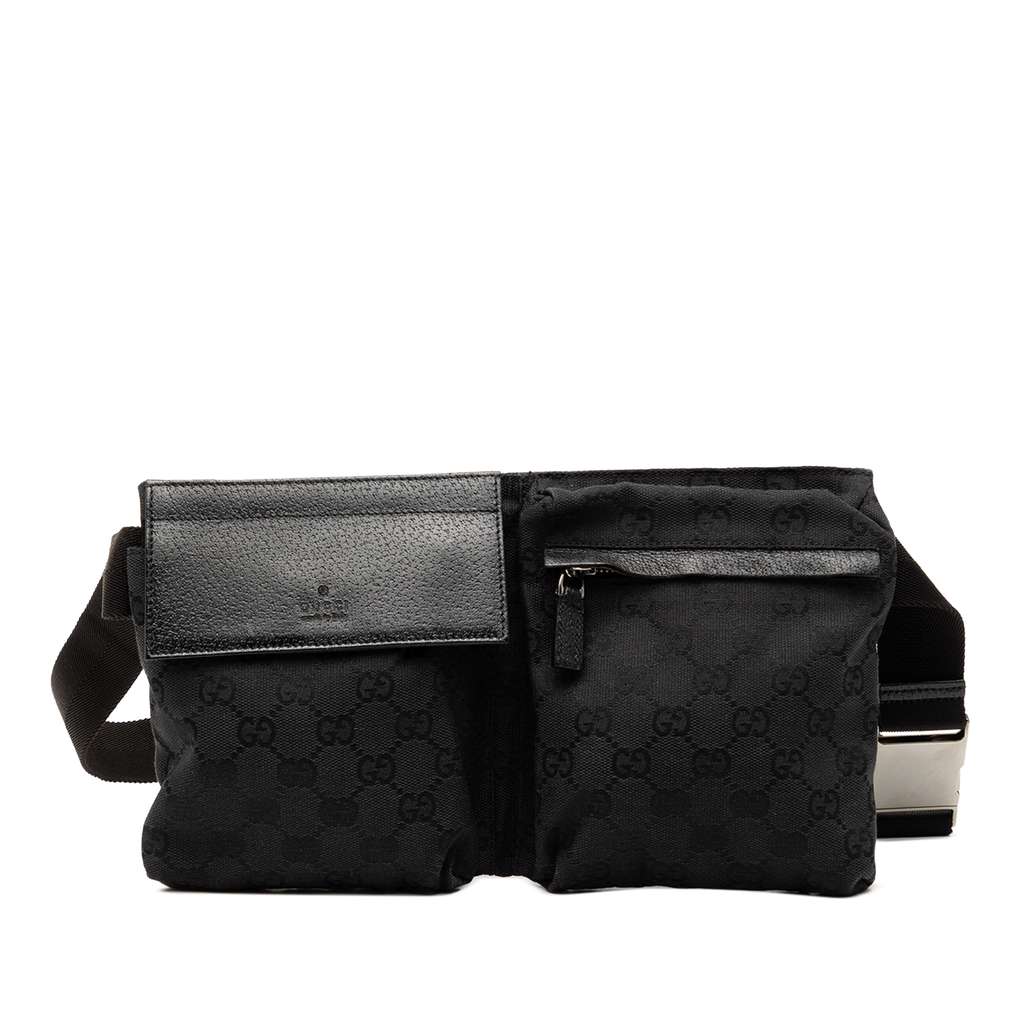 The GG Canvas Double Pocket features canvas body, an adjustable waist strap, exterior front flap and zip compartments, and an exterior back zip pocket.