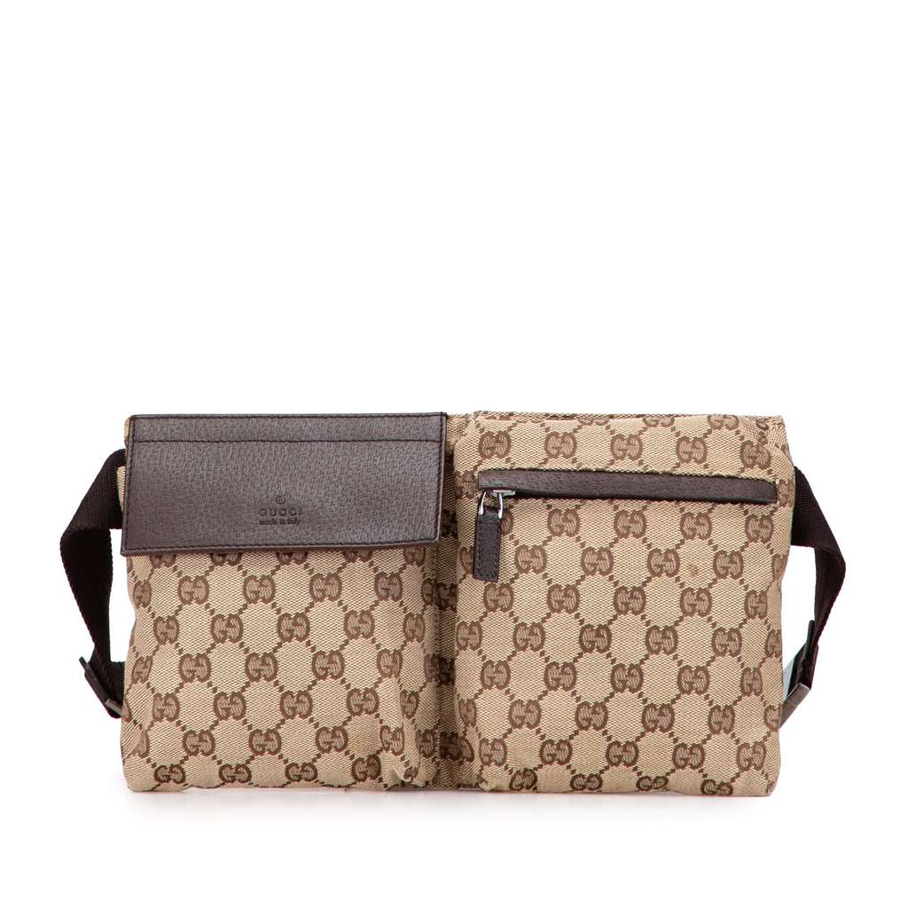 This belt bag features a canvas body with leather trim, an adjustable flat waist strap, exterior front flap and zip compartments, and an exterior back zip pocket.