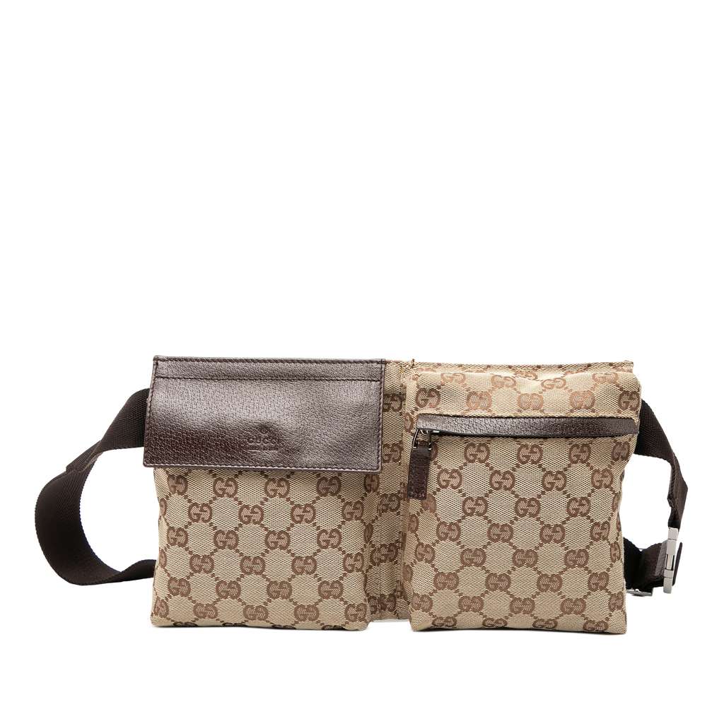 This belt bag features a canvas body with leather trim, an adjustable flat waist strap, exterior front flap and zip compartments, and an exterior back zip pocket.