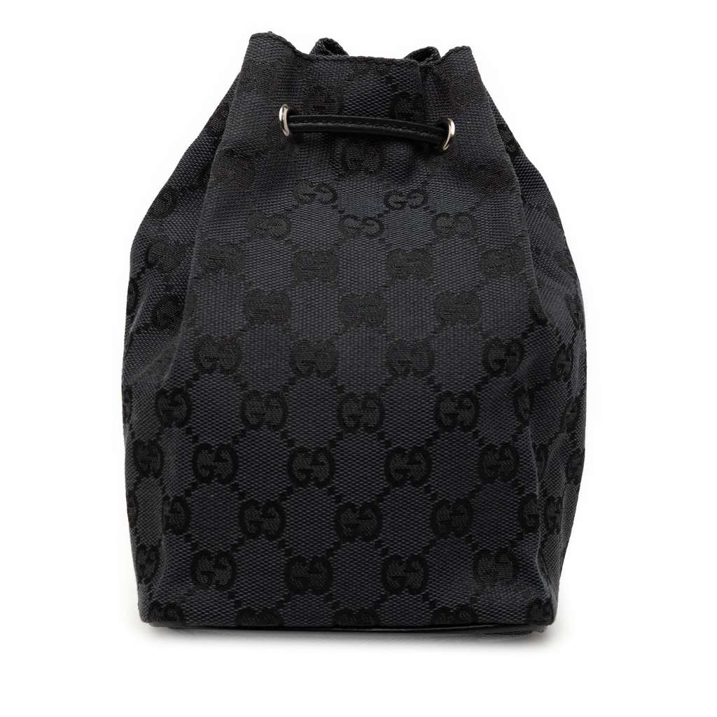 This bucket bag features a canvas body, flat leather straps, and a top drawstring closure.
