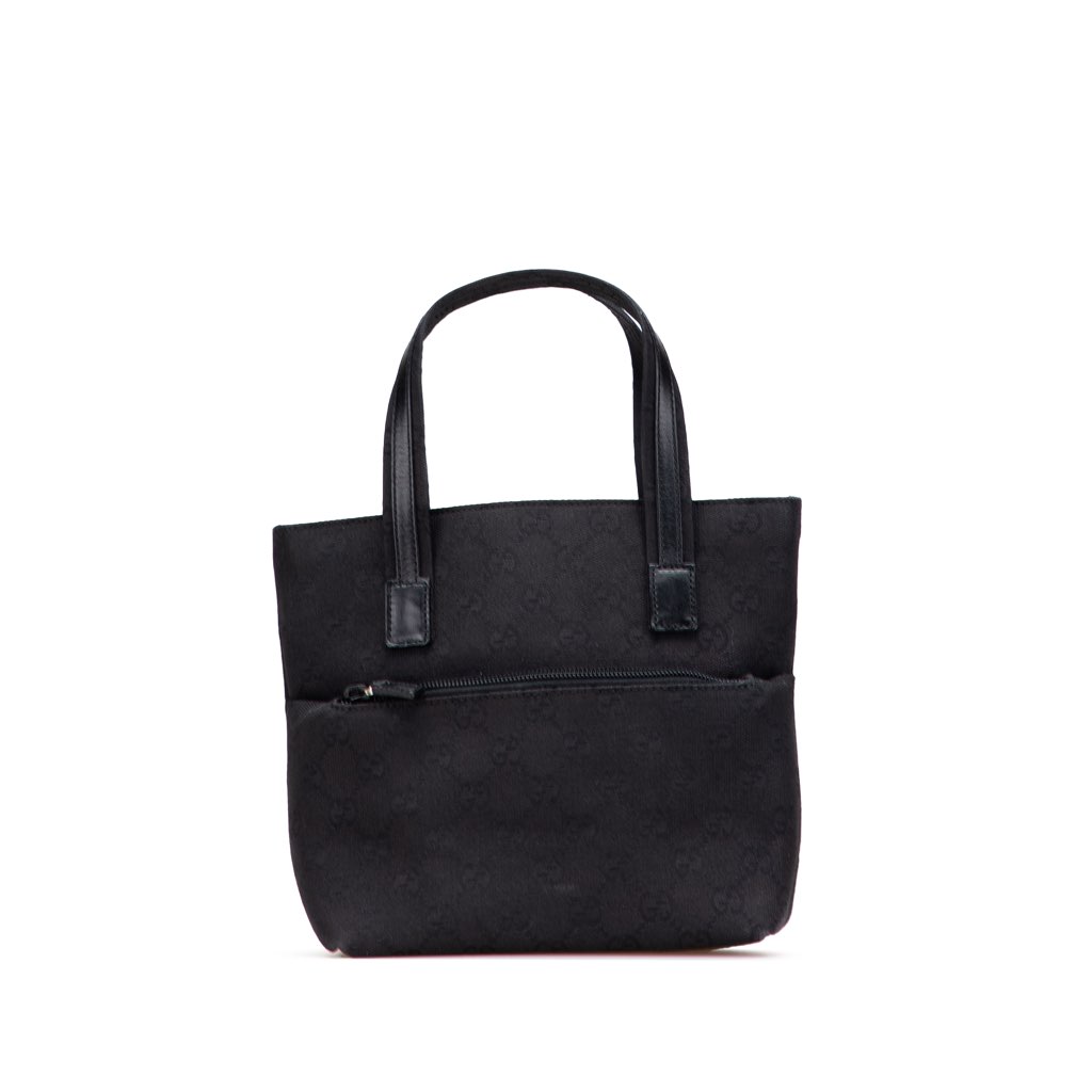 This handbag features a canvas body, flat leather handles, an open top, an exterior front zip pocket, and an interior zip pocket.