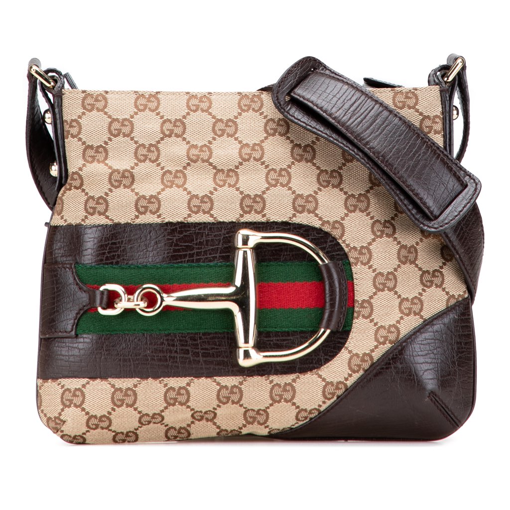 The Hasler crossbody bag features a canvas body with horsebit detail, a flat leather strap, a top zip closure, and interior zip and slip pockets.