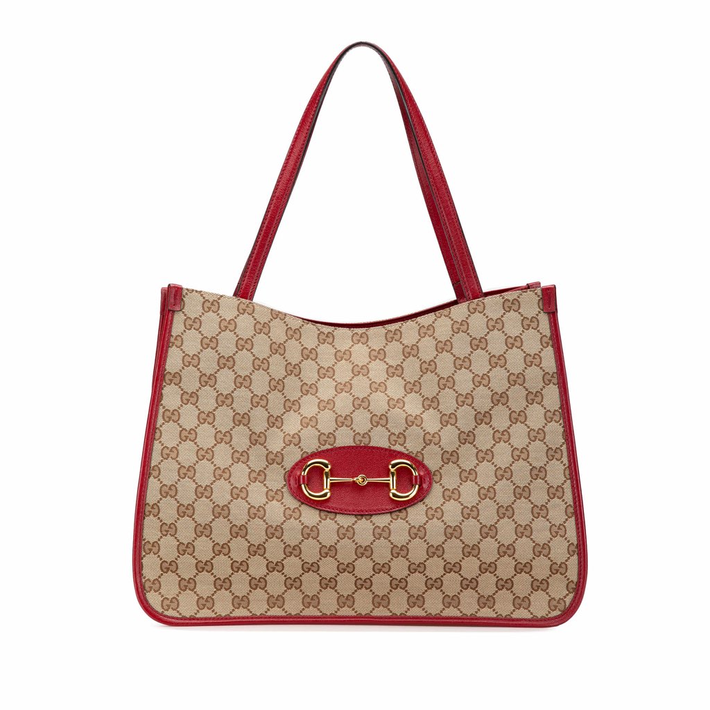 The 1955 tote bag features a canvas body with gold-tone hardware and leather trim, flat leather straps, an open top, and interior zip and slip pockets.