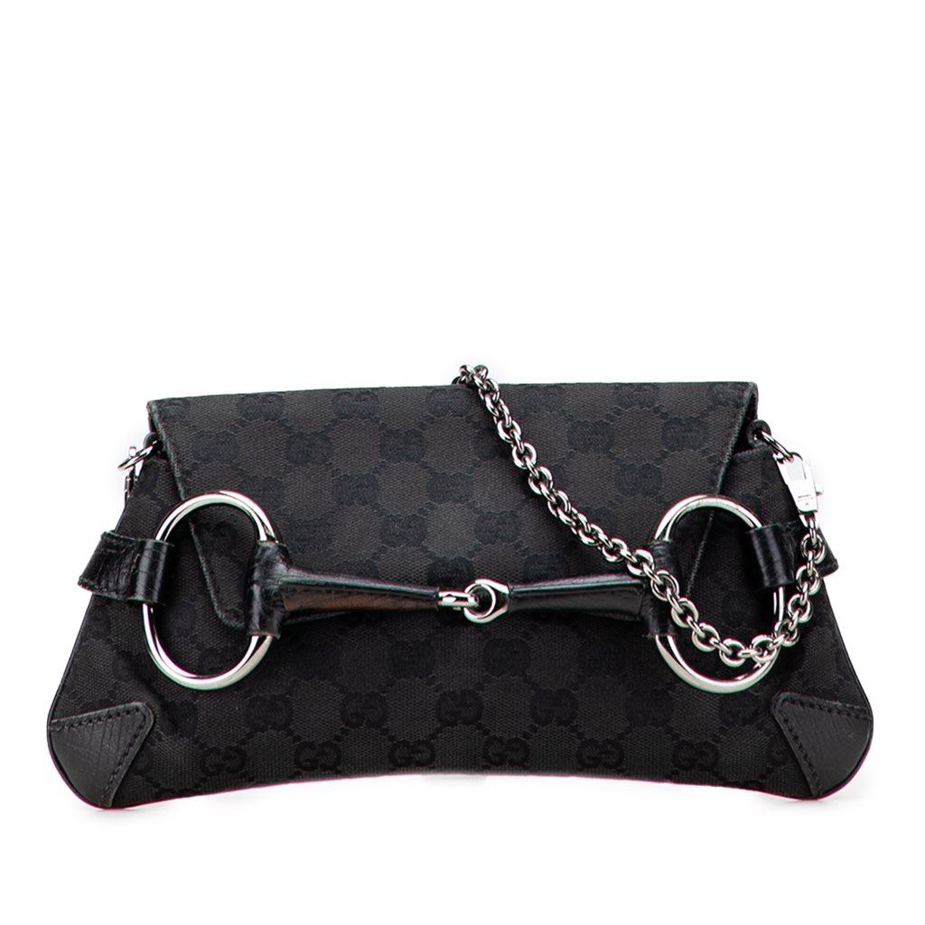 This shoulder bag features a canvas body with leather trim, a detachable chain link strap, a front horsebit detail, a front flap with slip through tab closure, and an interior slip pocket.