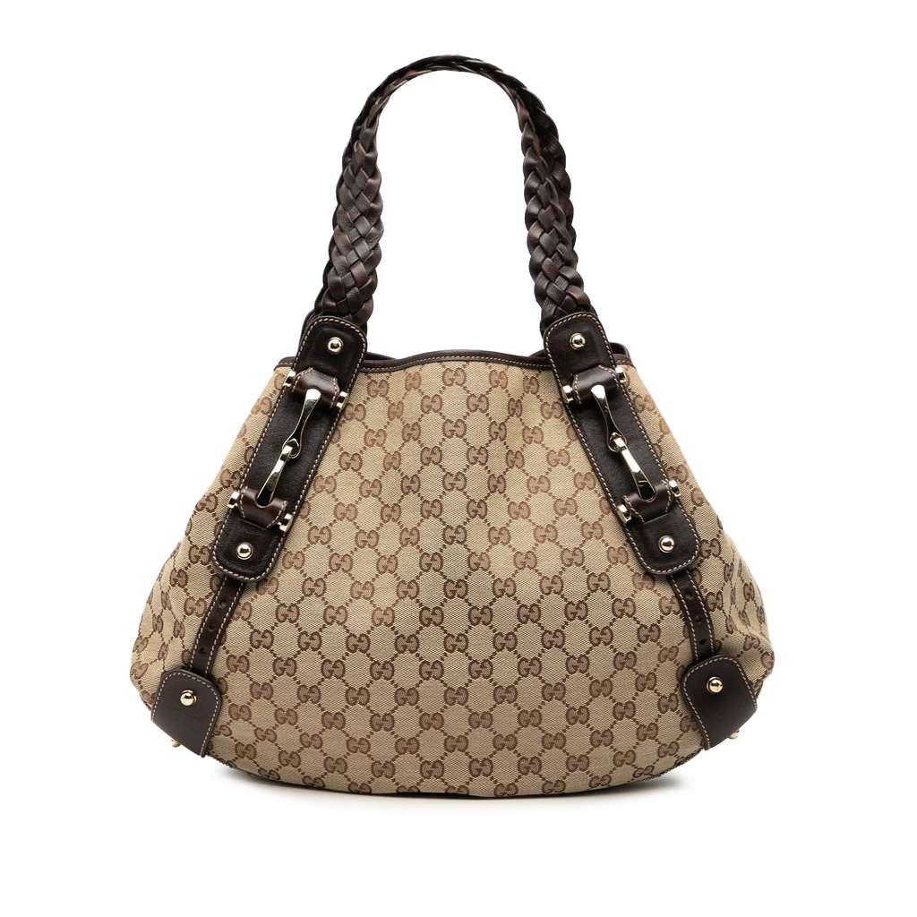 The Pelham shoulder bag features a canvas body with leather trim, braided leather handles, an open top with a snap button closure, and an interior zip pocket.