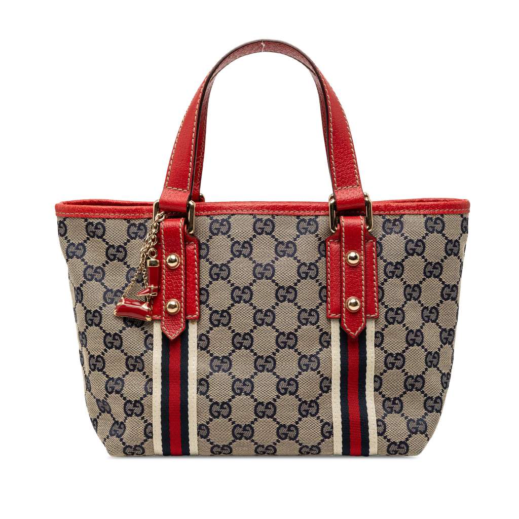 The Jolicoeur handbag features a canvas body with leather trim and web details, flat leather handles, an open top, and interior zip and slip pockets.