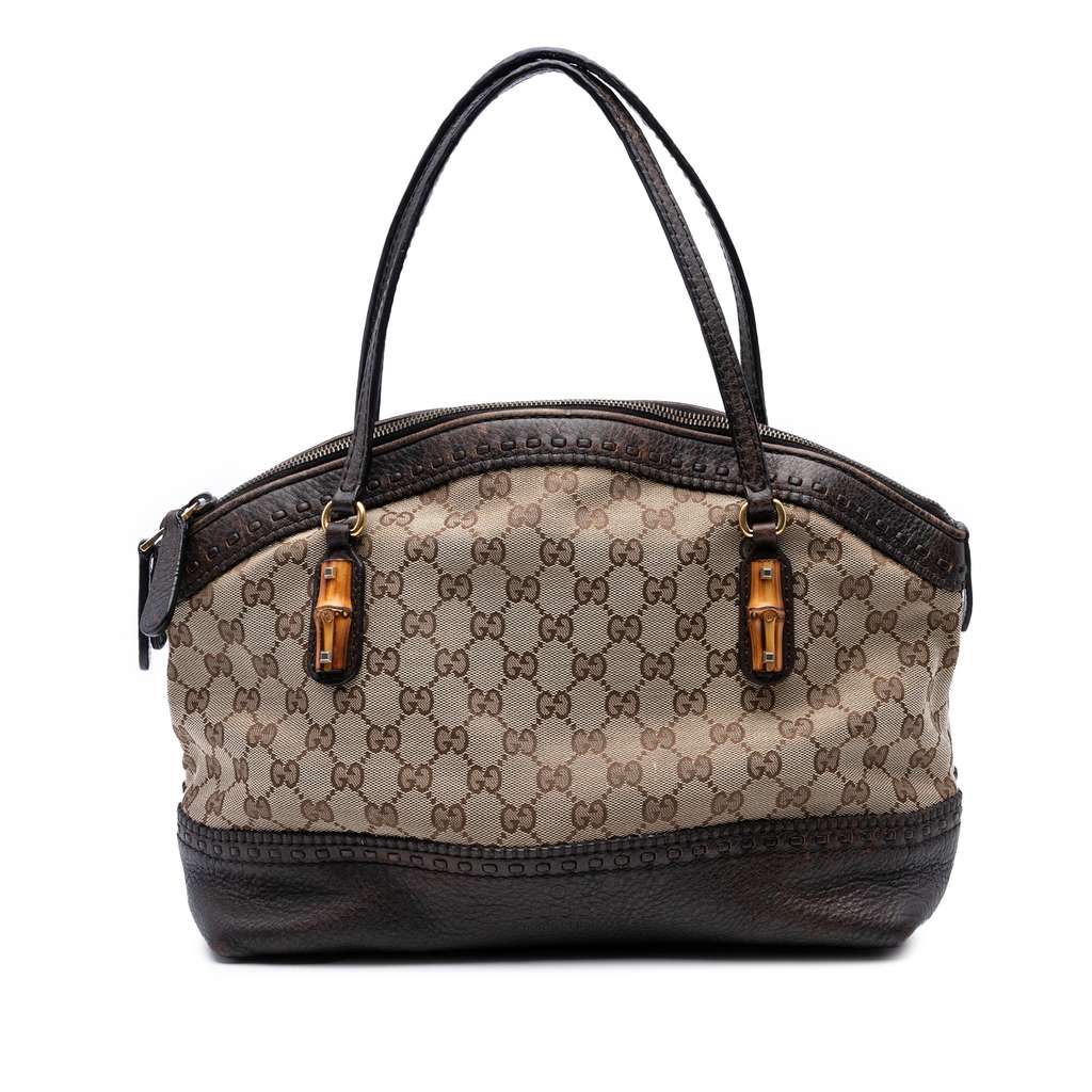 This handbag features a canvas body with leather trim and bamboo details, flat leather handles, a top zip closure, and interior zip and slip pockets.